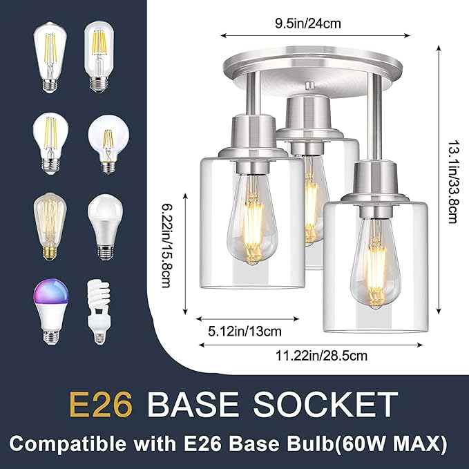 - 【Various Compatibility Dimmable Sockets】You can update the look of the ceiling light fixture at any time simply by replacing diverse bulbs. The hallway ceiling light fixtures apply 3 heat-resistant E26 standard blub sockets (Max. 60W), so you can use all E26 light bulbs to pair them. This bathroom ceiling light will be fully dimmable with a compatible dimmer switch and dimmable bulbs (for safe transportation, not come included).