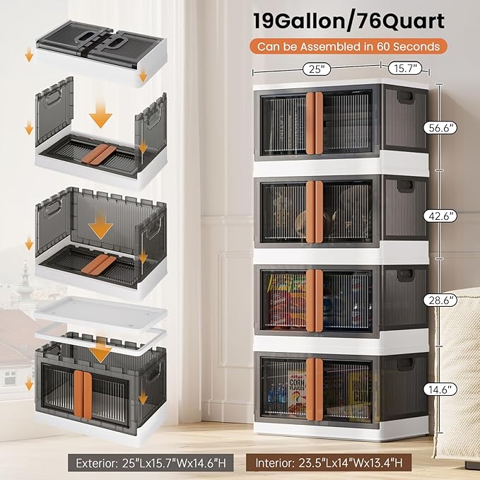 19Gal Collapsible Storage Bins with Lids & Wheels - 3 Pack Stackable with Doors, Heavy-Duty Plastic Containers for Home/Office, White
