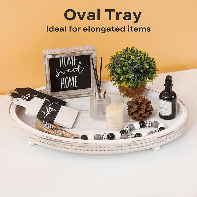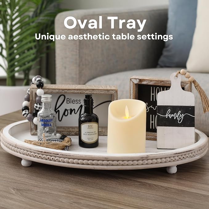 Wooden Tray,Oval Decorative Tray for Coffee Table Kitchen Dinning Table Entryway, Small Beaded Tray for Holidays, Farmhouse Centerpiece Decor Weathered White
