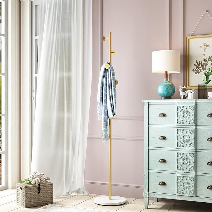 Gold Coat Racks, Metal Coat Rack Freestanding with Hooks, Entryway Coat Rack Stand, Coat Racks with Marble Base, Coat Tree for Hanging Clothes, Hats, Bags