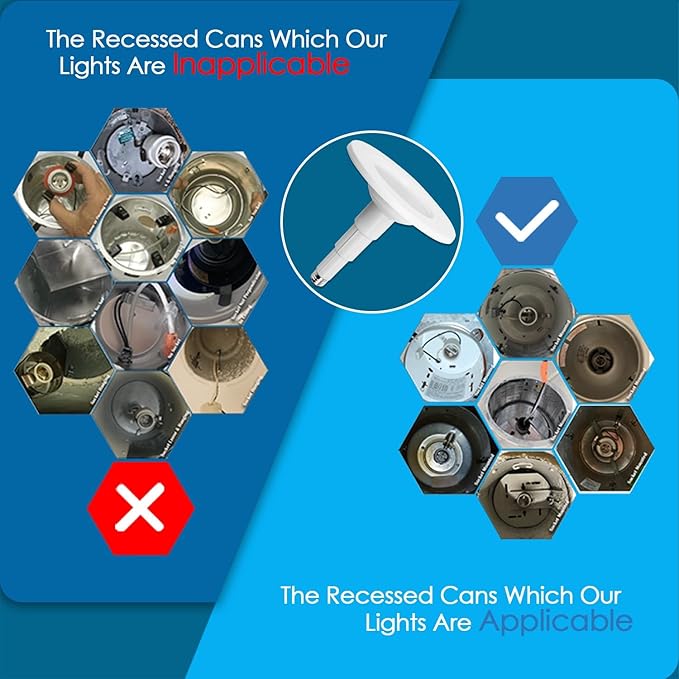 - SUPER EASY TO INSTALL-This retrofit led recessed lighting 6 Inch with patent protection design to install exactly like a light bulb. Just Screw in the E26 adaptor into the open socketand push up to fit the ceiling. Take 15 seconds to simple install. Size D7.48 x H8.27 inches. Fit most 5 or 6 inch recessed housing cans.