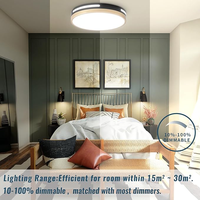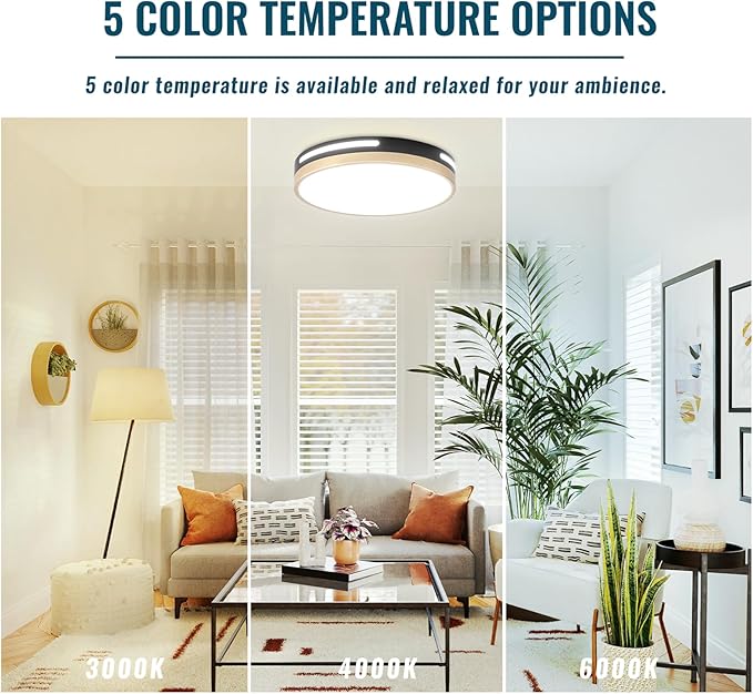- ๐ใ3000K/3500K/4000K/5000K/6000K Five Color Temperature & Stepless Dimmingใ Wheatronic bedroom lights for ceiling light offers five selectable color temperatures: 3000K (Warm White), 4000K (Neutral White), and 5000K (Daylight White)for different rooms including bedroom, bathroom, kitchen, living room, restroom, laundry room, washrooms, closets, hallway, stairway, dining room, workshop garage, nursery room, kidsโ room. Additionally, this LED round close to ceiling light fixtures can be easily dimmed from 10% to 100% with a compatible dimmer (not included) to create the perfect ambiance for any occasion.