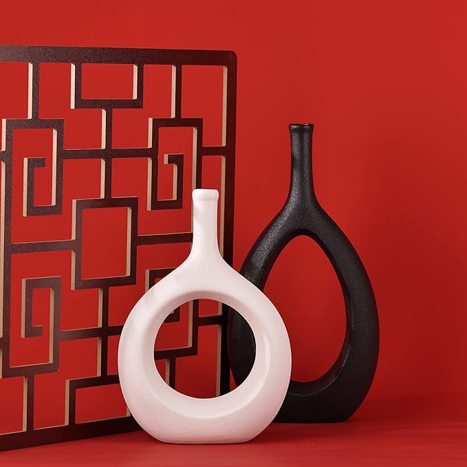 - 【Hollow Elliptical Vases】The of Black and white Ceramic Vase is the characteristic of modern decoration,Minimalism Art Decorations for your Home. Simple Style with Special Geometric modeling fit for most home decor collection. Work great with your exotic houseplants, florals, beautiful bouquet. Perfect coordinate with your other shelf decor, floor table decorations, fireplace décor and entry table décor