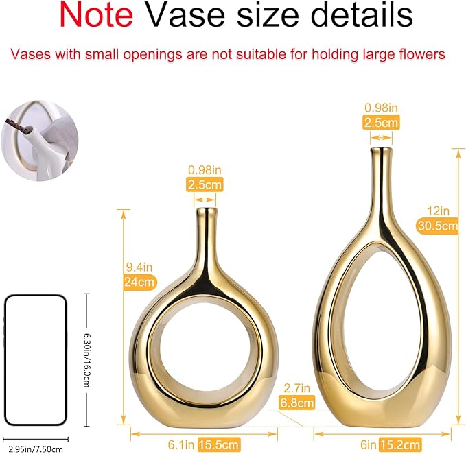 - 【Glossy gold vases】our light luxury ceramic gold vases 2-piece set,they come in different shapes and sizes, put together for display instantly becomes a stunning art decoration,whether displayed alone or with flowers. Our glossy gold vases can play a great decorative role in your home.And guests will inevitably be attracted by its elegant appearance. Vase size: Large (h12in - l6.0in - w2.7in),small (h9.4in - l6.1in - w2.7in). Small mouth vase note the size