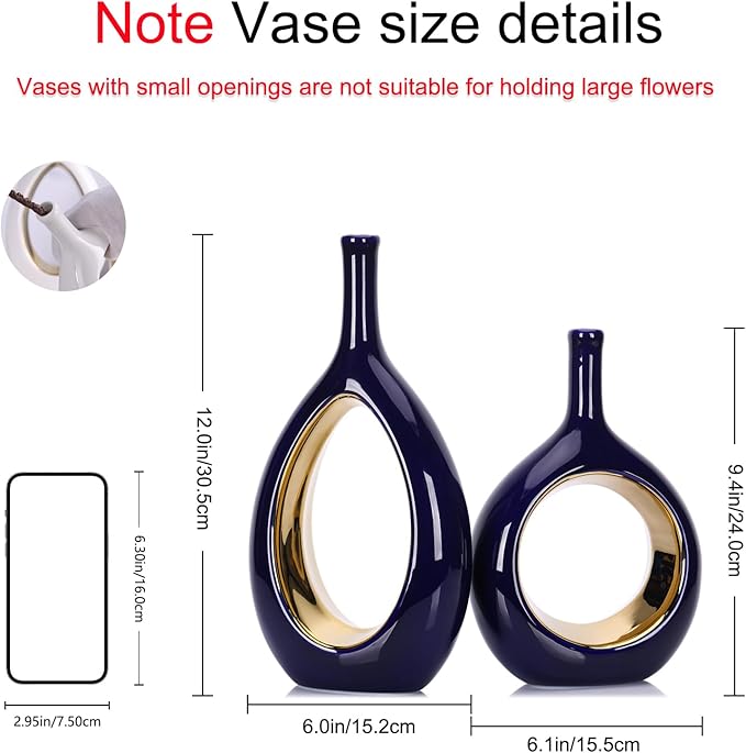 - 【Royal Blue and Gold vases】our light luxury ceramic blue and gold vases 2-piece set,they come in different shapes and sizes, put together for display instantly becomes a stunning art decoration,whether displayed alone or with flowers. Our glossy royal blue vases can play a great decorative role in your home.And guests will inevitably be attracted by its elegant appearance. Vase size: Large (h12in - l6.0in - w2.7in),small (h9.4in - l6.1in - w2.7in). Small mouth vase note the size