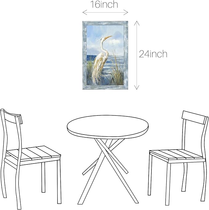 - The framed coastal ocean sea bird wall art is 24 inches x 16 inches. Ideal size for leveling up senses of any interior spaces. Simple yet classic design makes the coastal egret wall art decor a modern decoration to fill up blank walls of bedroom, bathroom, living room, dining room, kitchen, hallway or office