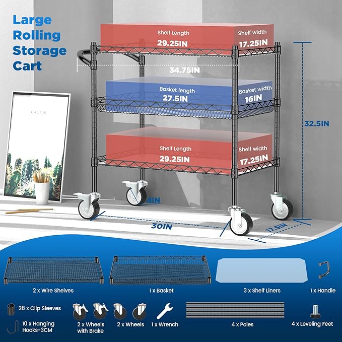 - 【Easy to Assemble Metal Utility Cart】: Simple 3 tier rolling cart structure, all parts are in the package, no tools required to assemble. Our utility carts with wheels also can be used as kitchen storage cart, dining cart, service cart, tool cart, etc. Ideal for a variety of environments, like dining rooms, kitchens, restaurants, garages and utility rooms, warehouses, office and studios. NOTE: Please refer to the instruction manual for specific assembly steps.