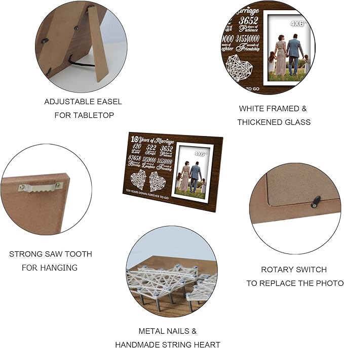 10 Year Anniversary for Him Her - 10th Year Wedding Marriage Husband and Wife Picture Frame 4x6 Inches - 120 Months Couple Bedroom Decor with Photo