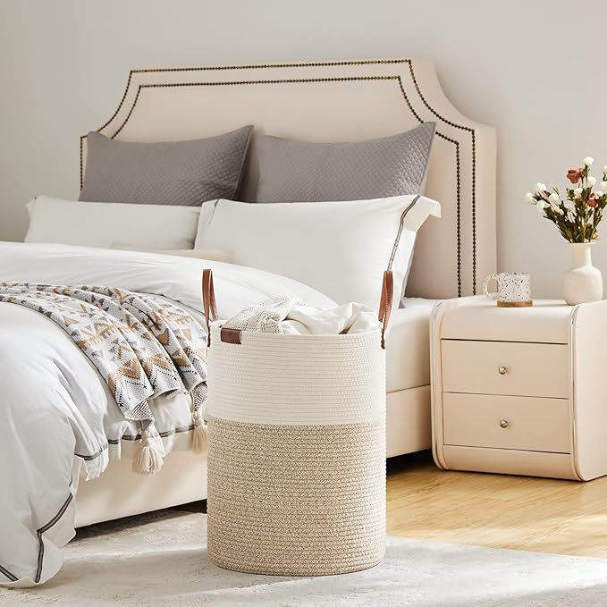 VIPOSCO Tall Laundry Basket, Large Dirty Clothes Hamper with Leather Handle, Woven Rope Storage Basket for Blanket, Toy In Living Room, Bathroom, Bedroom - 58L White & Brown