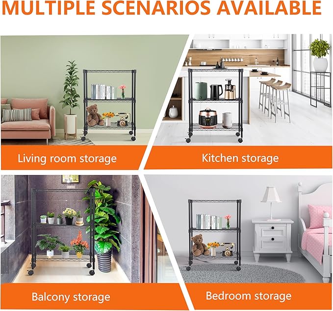 BestOffice | 3-Tier Wire Storage Shelves with Wheels | 23x13x31 | Black | Adjustable Racks | Heavy-Duty Metal Shelf, Holds Upto 170 lbs | No-Tool Assembly | Ideal for Home & Garage Shelving
