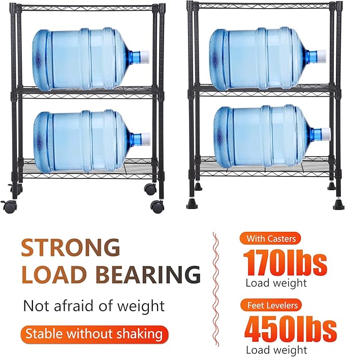 - HEAVY-DUTY & FLEXIBLE SETUP: Use feet levelers for up to 450 lbs total (150 lbs per shelf) or caster wheels for easy mobility, supporting up to 170 lbs when weight is evenly distributed.