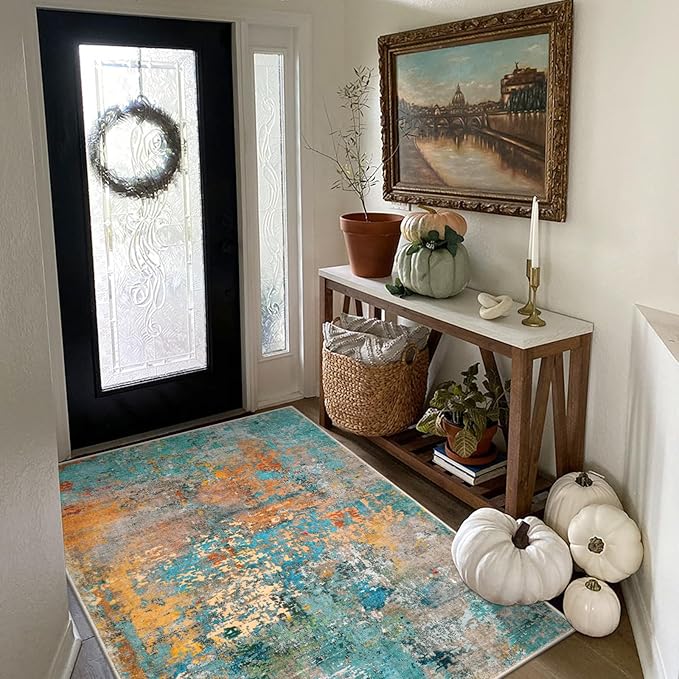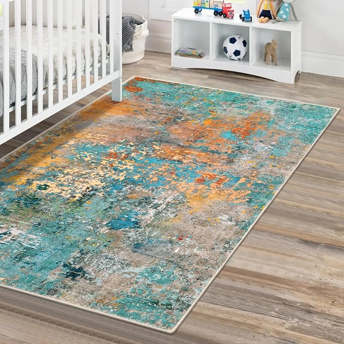 - [Modern Abstract Area Rug] - Add a pop of color for you home with this area rug. Designed with delicate palette, this collection impresses with an abstract print with splashes of blue, orange, yellow, and gray hues. It looks like a sunset, gives people a relaxing feeling, suitable for modern industrial and contemporary homes.