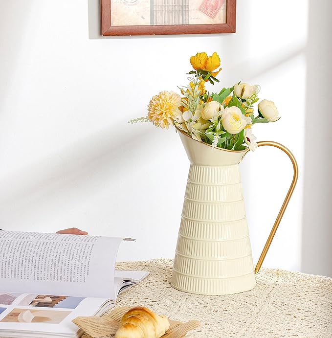 Elegant Cream/White Metal Pitcher Vase, Farmhouse Galvanized Flower Vase, Rustic Decorative Milk Jug for Home Decor, 10.8''H