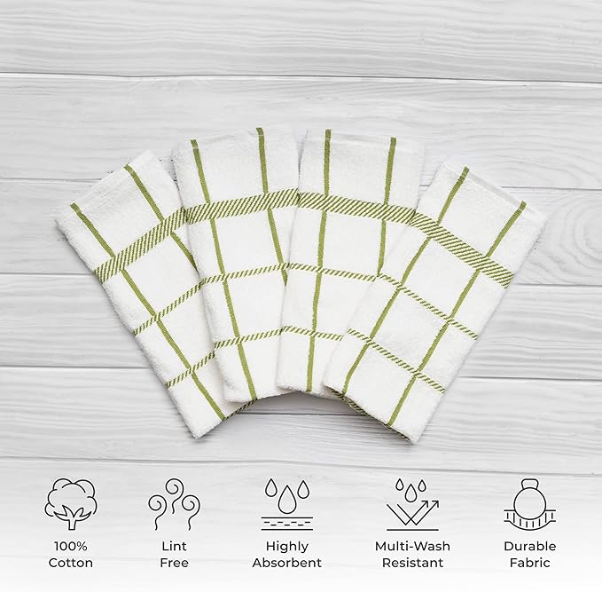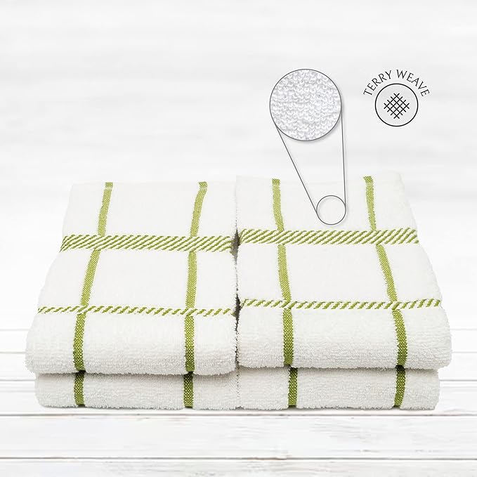 100% Cotton Terry Dish Towels, 4 Pack Checks, 16 x26 Inches, Super Soft and Absorbent Kitchen Towels, Perfect for Kitchen Cleaning and Dish Washing | Green