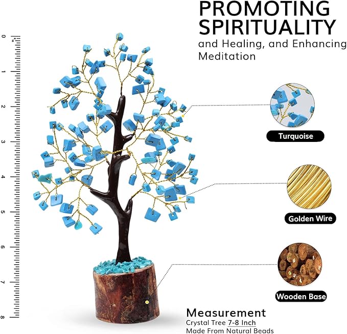 - Turquoise Gemstone Tree – A 7–8 inch handcrafted crystal bonsai tree made with 100 raw turquoise chips and golden wire branches, secured on a strong wooden base.