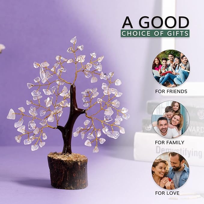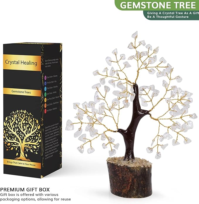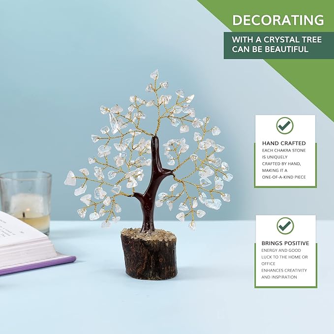 - Clear Quartz Gem Tree – This 7–8 inch handcrafted crystal bonsai tree features 100 clear quartz chips carefully wired onto adjustable branches for a clean, elegant look.