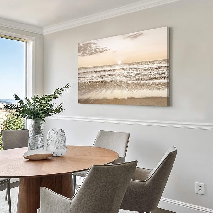 - BEACH PICTURE WALL ART CANVAS: The ocean waves canvas wall art comes professionally gallery-wrapped. Tightly stretched across a sturdy shrink-resistant wooden frame and stabled on the stretcher bars, the ocean sunset wall art is of longer durability for displaying on the wall