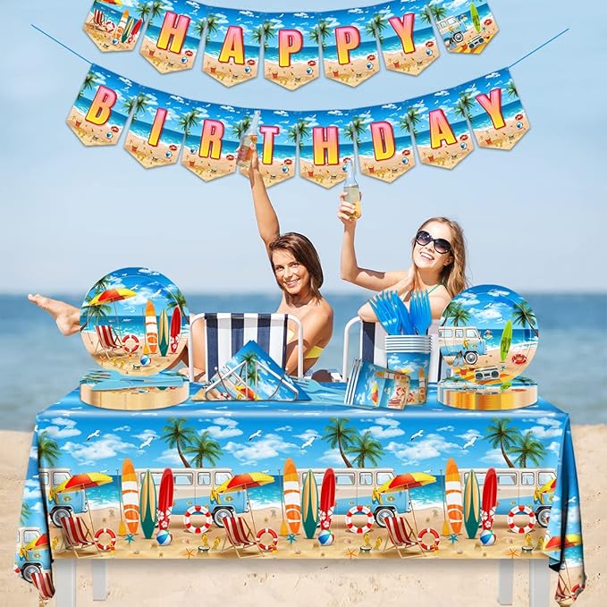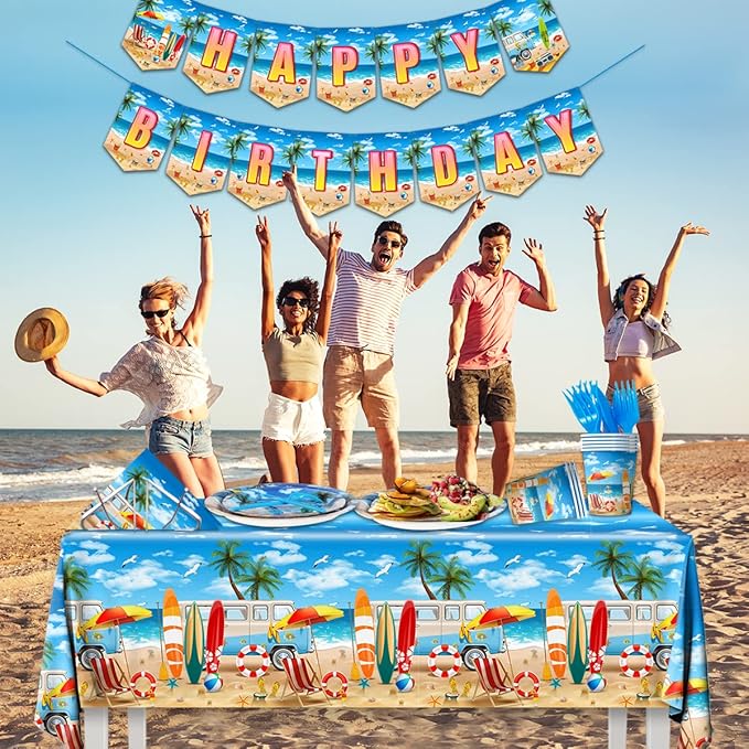 - 【Beach birthday party suit】 You will receive 142 pieces of Hawaiian swimming pool party decorations, and the Happy Birthday Banner on Summer Beach * 1PCS (5.51 × 7.08 inch) beach tablecloth * 1PCS (86.61 × 51.18inch) pool beach napkin * 40PCS (6.5 x 6.5inch) dinner plate * 20PCS (9inch) small plate * 20PCS (7inch) cup * 20PCS (90oz) knife and fork * 20PCS, enough to hold a fun summer party!