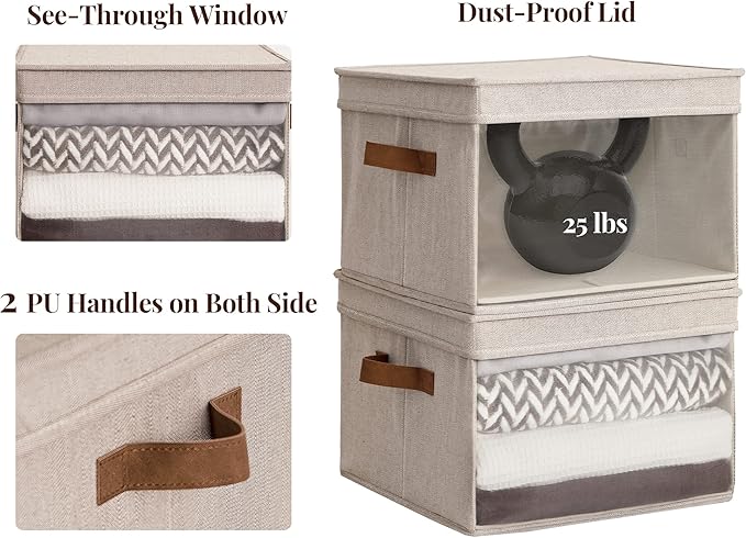 StorageWorks Storage Bins with Lid and Clear Window, Fabric Storage Boxes with Lids, Stackable Basket for Shelves, Closet Organizer and Storage Bins, Brown and Beige, Large, 4-Pack