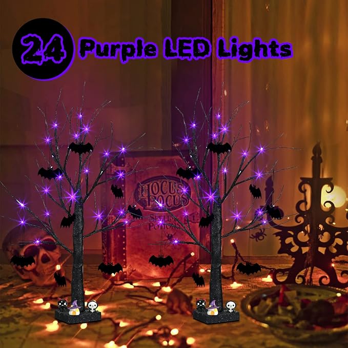 - Halloween Indoor Decorations: 2 FT black Halloween tree decorated with 24 purple lights; There is also a bag of Halloween tree ornaments in package with 8 bat ornaments and 3 mini figurines to create a unique Halloween decorations indoor