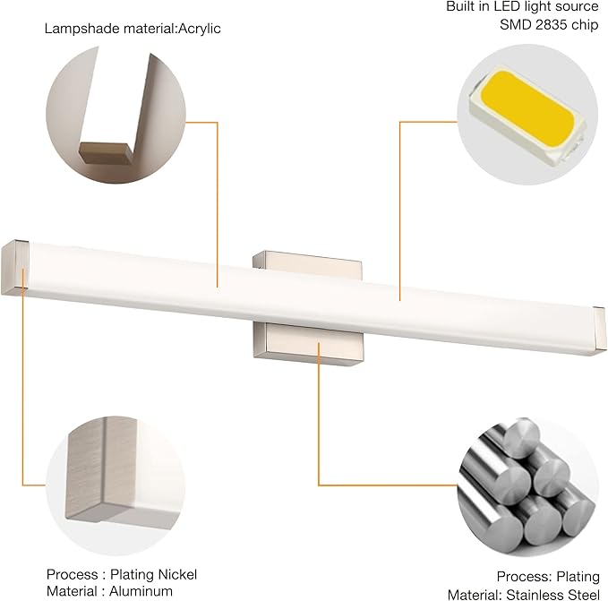 - 【Original Design 】Own US Patent Certificate,Modern design, brushed nickel base and white acrylic. For bedroom, it is a wonderful makeup vanity light. As the bathroom vanity light, it works well too.