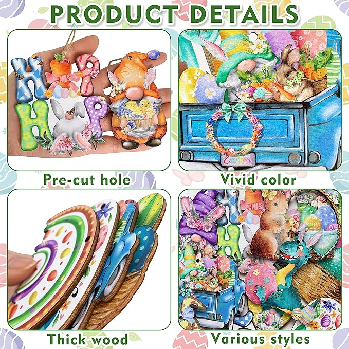 - New Designed Easter Wooden Tree Ornaments -- 24 PCS Easter wooden slices with exquisite workmanship in 12 different styles are made of high-quality wood, painting in front and empty at back.