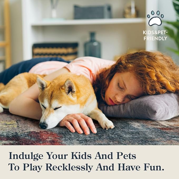 - [Modern Abstract Area Rug] - Add a pop of color to your living room or bedroom with this area rug. Designed with a delicate palette, this collection impresses with an abstract print with splashes of red, blue, yellow, and beige grey hues. Its purposefully faded look fits right in modern industrial and contemporary homes.