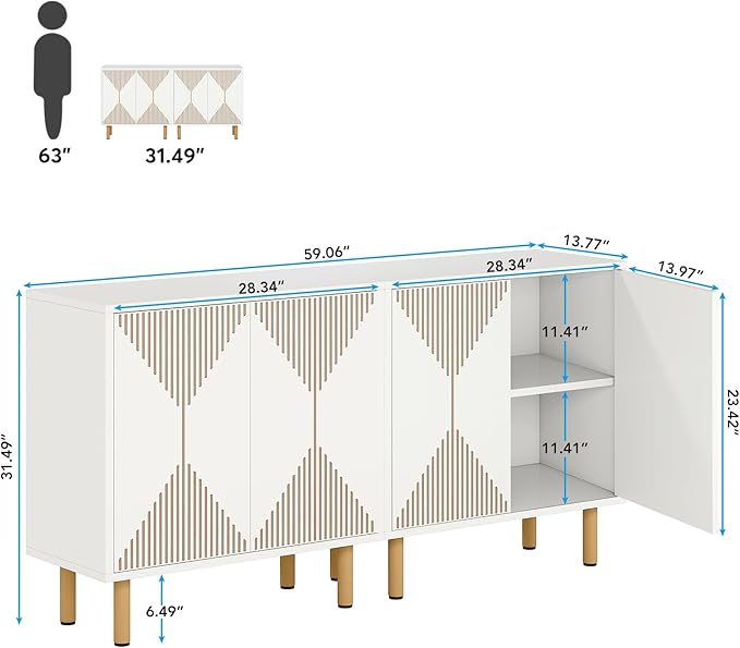 - Stylish and Practical: The body of the modern accent cupboard cabinet is crafted from durable and easy-to-clean manufactured wood. The white doors feature a unique carved design that adds a touch of modern sophistication to any space. The combination of practicality and style makes this sideboard an excellent addition to any home.