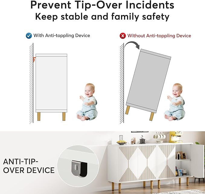 - Enhanced Stability: The white sideboard cabinet is equipped with an anti-toppling device to ensure stability and safety, especially for households with children. The unit can be securely fastened to the wall, while the 5 thick metal legs provide solid support and a weight capacity of up to 200 lbs.