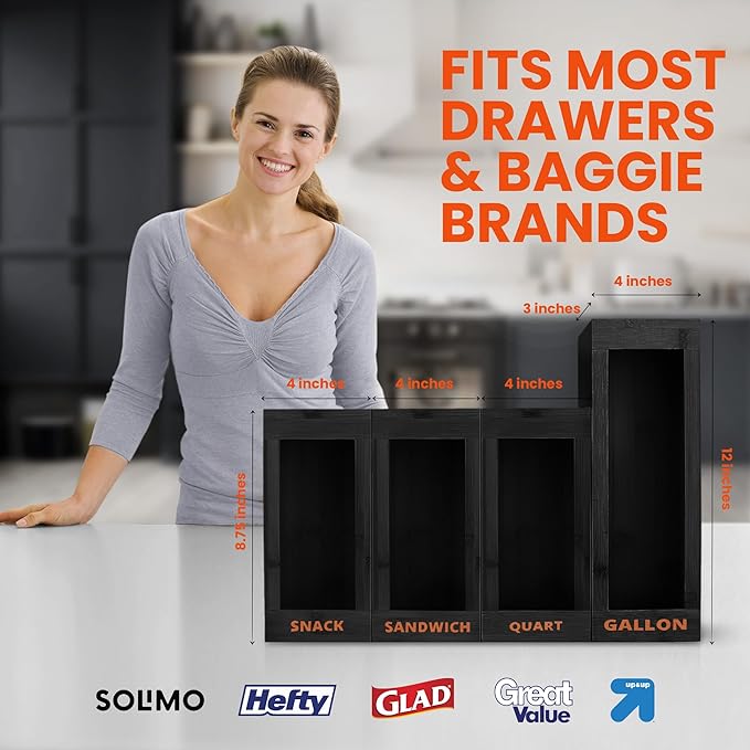 Bag Storage Organizer - Bamboo Food Plastic Baggie Holder, Dispenser, and Container for Kitchen Drawer - Fits Major Brand's Gallon, Quart, Sandwich & Snack Sized Slider Bags (Black)