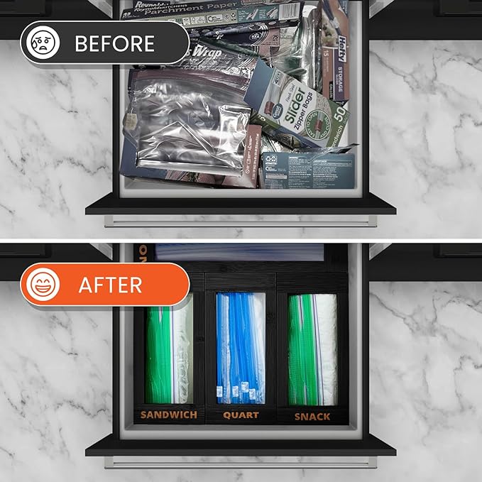 - Comes Ready To Use - Transform your kitchen with ease, mess-free, and with no hassle! Our kitchen bag organizer for drawers comes fully assembled and with non-slip dots.