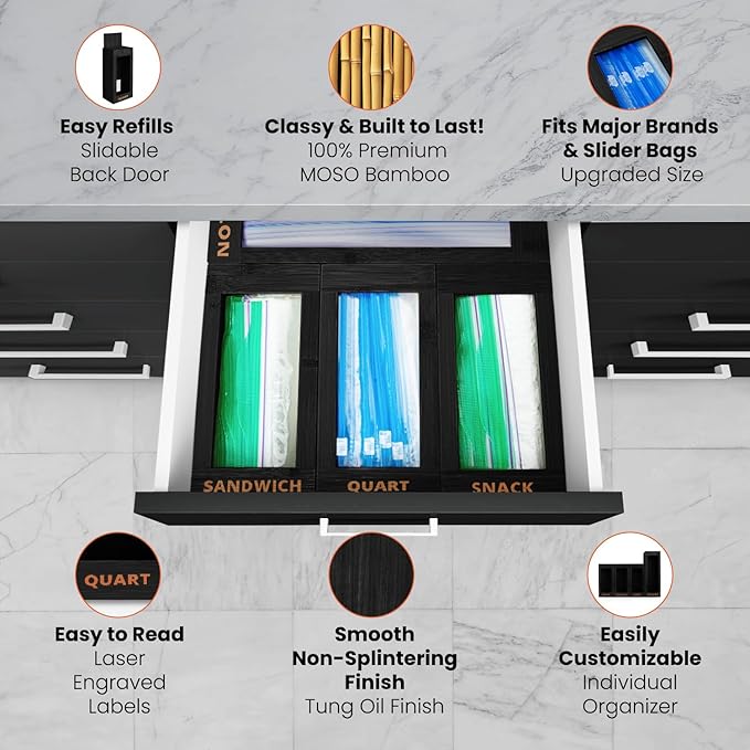 - Transform Your Kitchen - Elevate the feel and look of your kitchen with our plastic bag storage organizer. Our kitchen drawer organizer set is made of durable premium laminated MOSO bamboo for a timeless look.