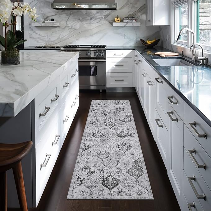 Lahome Moroccan Trellis Washable Runner Rug, 2x6 Kitchen Runners for Hallways 6 Feet Non Slip, Vintage Laundry Room Rug Ultra-Thin Long Carpet for Bathroom Bedroom Entryway, Silver/Grey