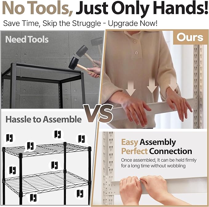 - [ DURABLE AND SAFE ] : Our shelves are rust and scratch-proof, with a premium powder coating that's free of toxic heavy metals. We also include sixteen post-caps to protect your floors from scratches.