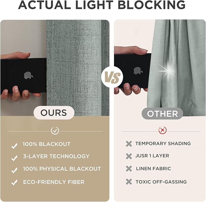 - 100% Total Blackout & UV Blocking: Achieve perfect darkness with these blackout curtains! The dedicated liner blocks 130% sunlight and UV rays, ideal for any bedroom or living room. This blackout curtain protects furniture from fading and helps regulate room temperature year-round.