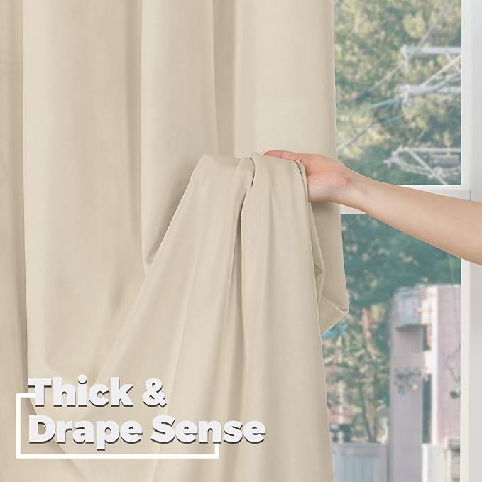 - Package Includes: Set of 2 cream beige soft velvet curtains; each panel measures 52 Inch wide by 84 Inch long, with 5 back tabs and 3” rod pocket fits most standard rods and makes the maximize coverage of windows.