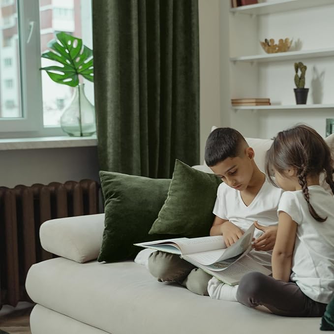 - Package Includes: Set of 2 olive green soft velvet curtains; each panel measures 52 Inch wide by 108 Inch long, with 5 back tabs and 3” rod pocket fits most standard rods and makes the maximize coverage of windows.