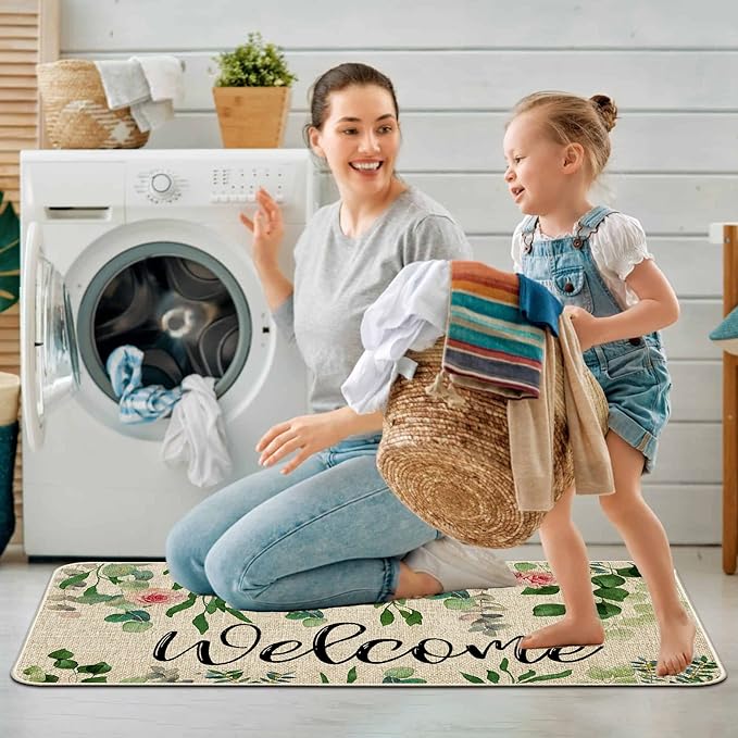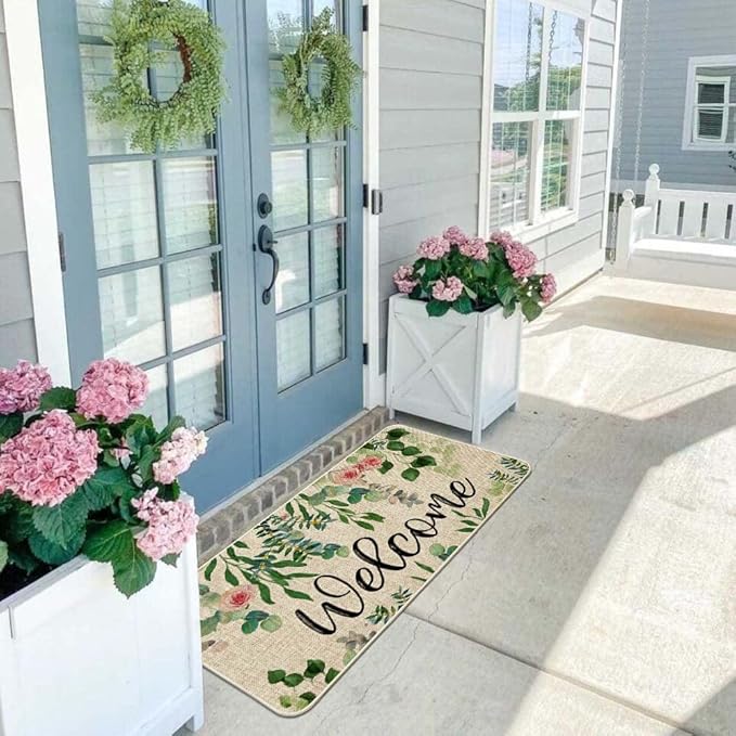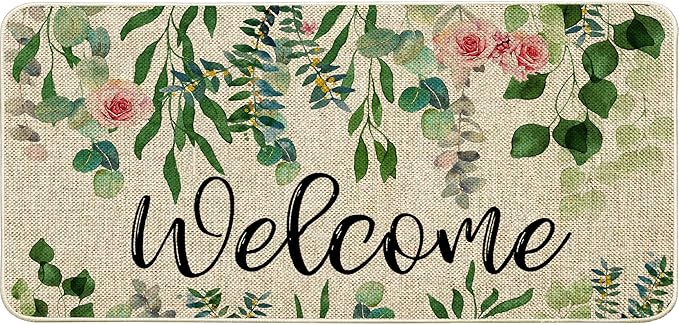 - Suitable Size: Spring eucalyptus leaves door mat measures 17”L x 36”W×0.3”H. This size fits most door widths.The low profile design prevents the house mat from getting stuck when opening and closing doors