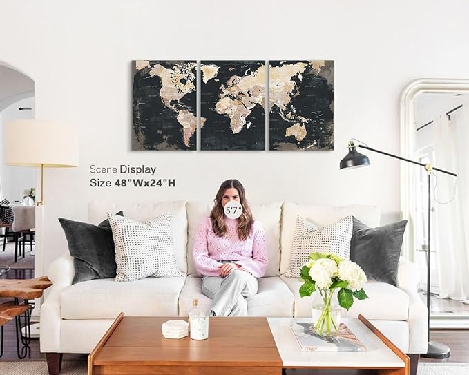 - DECORATIVE MAP - Professionally printed works of art on quality canvas. Each panel is 16" by 24", set of 3, the overall size is 48" x 24"