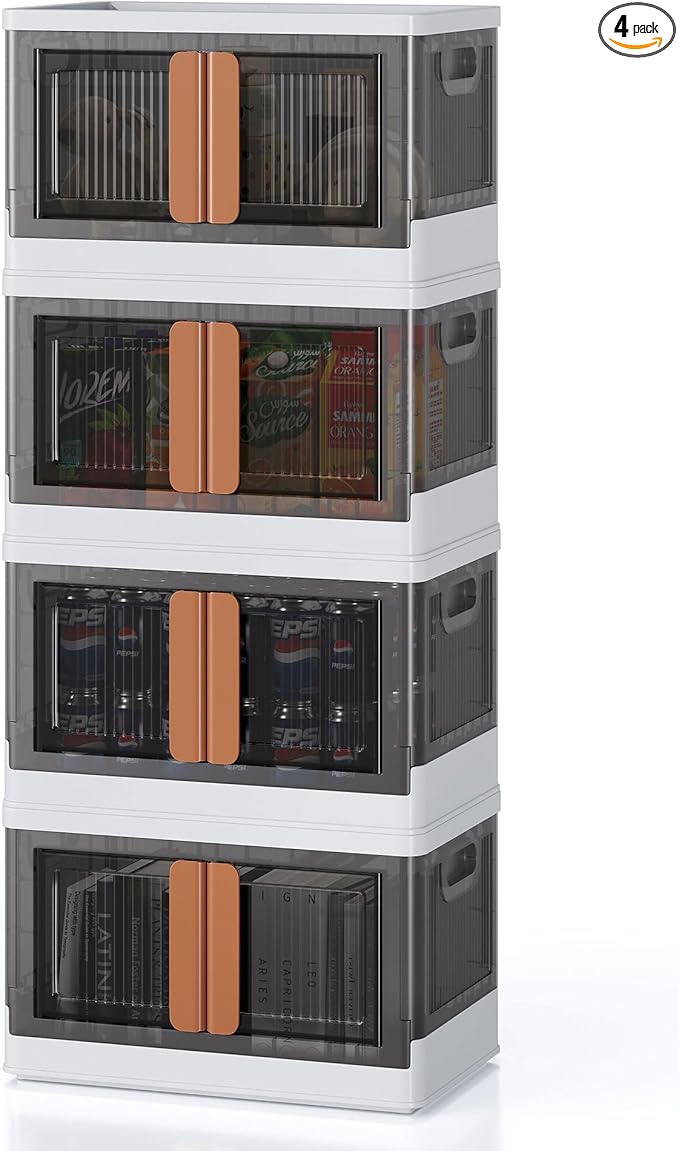 8.4Gal Collapsible Storage Bins with Lids & Wheels - 4 Pack Stackable with Doors, Heavy-Duty Plastic Containers for Home/Office, White