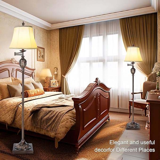Traditional LED Floor Lamp with 350° Adjustable Swing Arm Lamp – Vintage Standing Pole lamp for Living Room, Bedroom and Office – Rustic Upright Floor Light for Home Décor with Faux Silk Fabric Shade