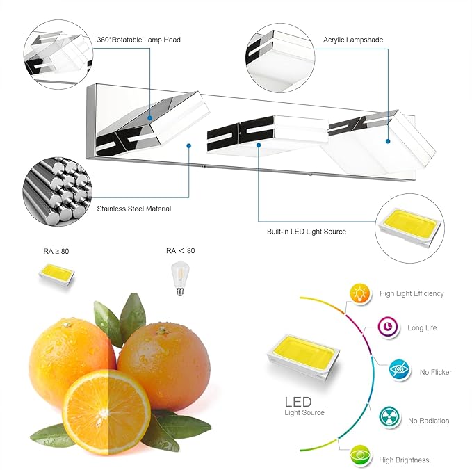 - 【Material】With advanced electroplate craft and sealing technology, dust-proof, fog-proof, anti-corrosion and moisture-proof, suitable for humid environments. The frosted white Solid Acrylic Lampshade is rugged, durable and unbreakable, provides excellent down lighting without glare. Gives a great contemporary look to your master bathroom.