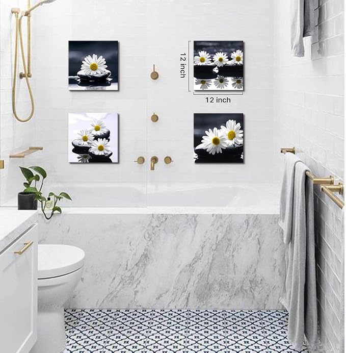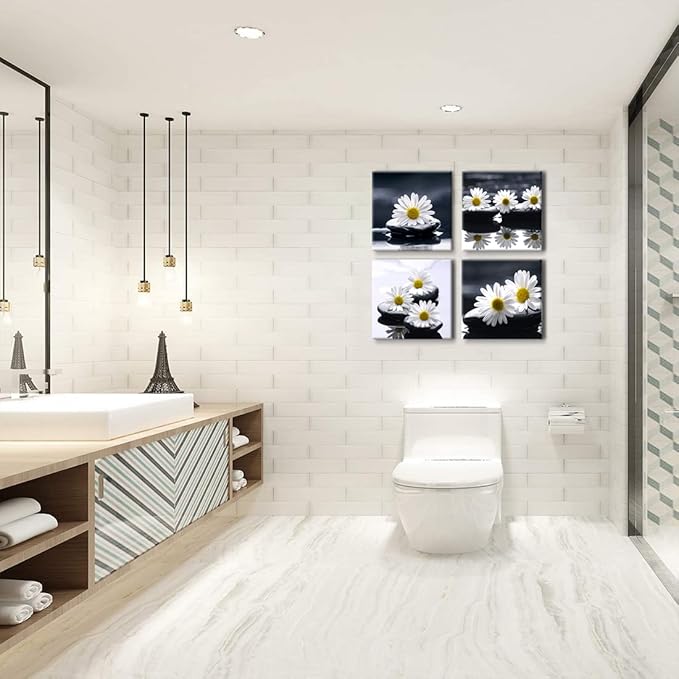 Yxbhhym-Black and White Wall Art Zen Décor Canvas Print Daisy Poster Painting Flower Stone Picture Meditation Artwork for Bathroom Decoration Dining Wall Art Bedroom Living Room Decor Office Framed