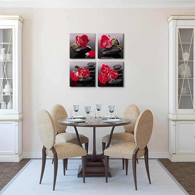 Yxbhhym-Black Red Canvas Wall Art Bedroom Stones Zen Wall Decor Rose Pictures Floral Poster print Spa Bathroom Wall Art for Living Room Decoration Kitchen Accessories Room Decor Framed Artwork