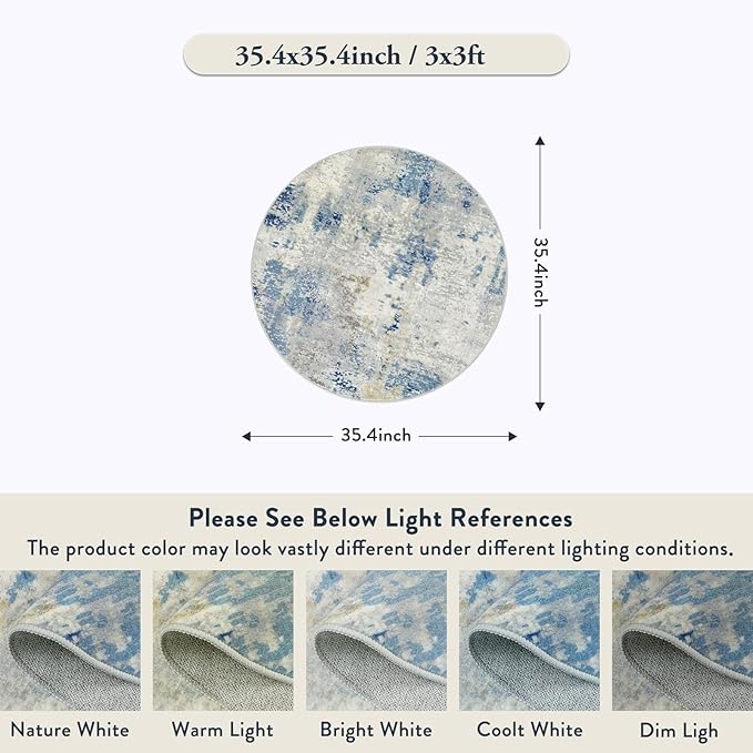 Lahome Modern Abstract Round Rug 3Ft, Blue Washable 3x3 Circle Rugs for Kitchen Entryway Soft Small Bedroom Mat Non Slip, Contemporary Indoor Floor Throw Carpet for Nursery Home Office
