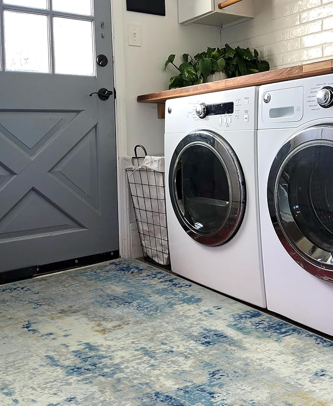 - [Modern Abstract Area Rug] - Add a pop of color to your living room or bedroom with this area rug. Designed with a delicate palette, this collection impresses with an abstract print with splashes of blue, yellow, and beige hues. Its purposefully faded look fits right in modern industrial and contemporary homes.
