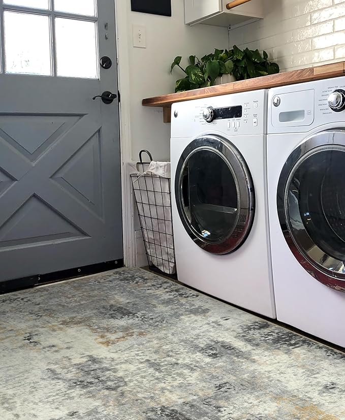 - [Modern Abstract Area Rug] - Add a pop of color to your living room or bedroom with this area rug. Designed with a delicate palette, this collection impresses with an abstract print with splashes of grey, yellow, and beige hues. Its purposefully faded look fits right in modern industrial and contemporary homes.
