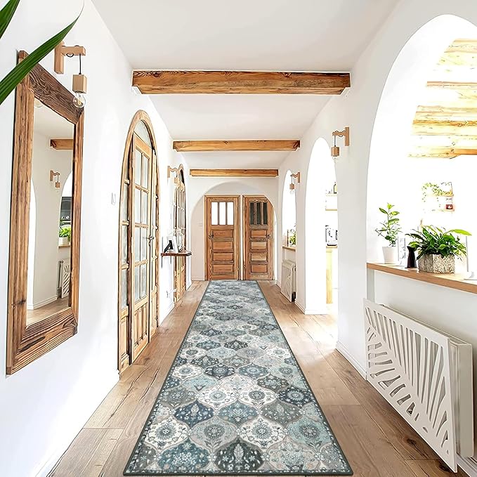 Lahome Moroccan Hallway Runner Rug Non Slip, 2x10 Washable Runner Rugs for Hallway 2x10 Vintage Ultra-Thin Throw Long Carpet for Kitchen Entryway Bedroom Laundry Room, Blue