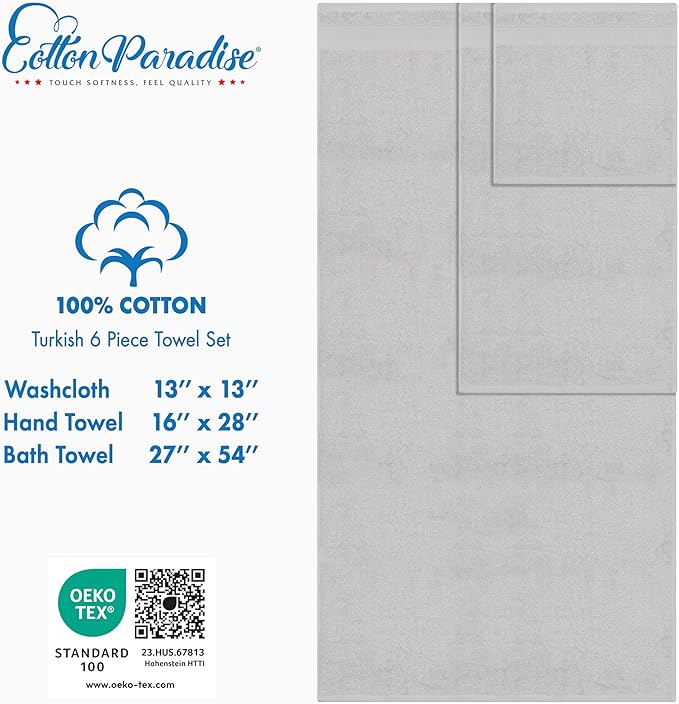 Cotton Paradise 6 Piece Towel Set 100% Cotton Soft Absorbent Turkish Towels for Bathroom 2 Bath Towels 2 Hand Towels 2 Washcloth Silver Gray Towel Set