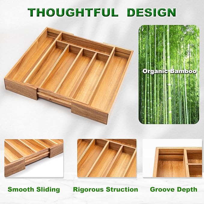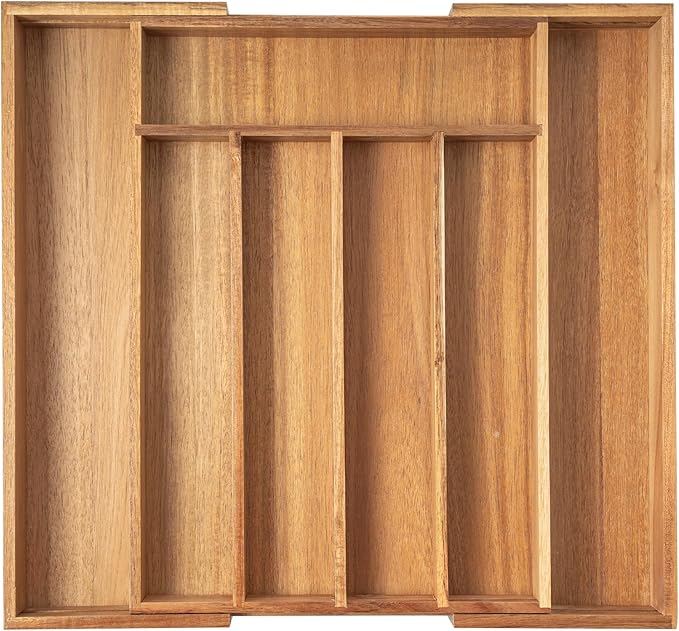 - 【Maximize your space, time, and effort 】Our cutlery organizer is great not only for cutlery organizer but also as a kitchen drawer organizer for large utensils such as spatulas, tongs, ladles, and more. The acacia drawer organizer can tame your out-of-control kitchen drawers, to do kitchen drawer organization according to your rules. Keep everything accessible and organized, so that you don't have to rifle around for your cooking tools.